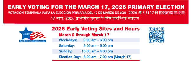 Early voting at the downtown Supersite (137 S. State St.) and on the sixth floor at the Chicago Board of Elections offices (69 W. Washington) is already underway. All 50 Ward Early Voting sites and the Board Supersite will be open as vote centers on Election Day. For more information about voting, including potential changes to your Election Day polling location or to request a vote by mail packet, please visit www.chicagoelections.gov.